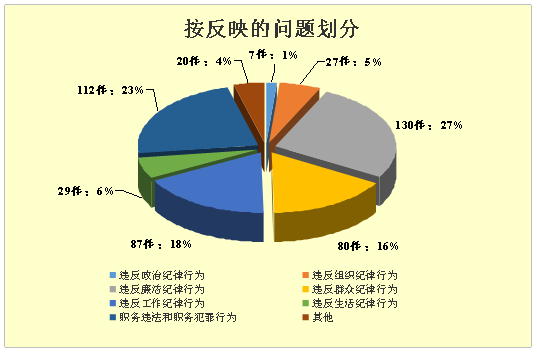 从纪检监察检举控告类违纪涉法行为来看:违反政治纪律行为7件,违反组织纪律行为27件,违反廉洁纪律行为130件,违反群众纪律行为80件,违反工作纪律87件,违反生活纪律行为29件,职务违法和职务犯罪行为112件,其他违法犯罪行为20件。