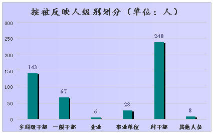 从检举控告中反映的职级看,反映乡科级、农村的较为突出,占总量的41.6%。具体为:反映乡科级干部143件,占29.1%;村干部240件,占48.8%;一般干部67件,占13.6%;企业6件,占1.2%;事业28件,占5.7%;其他人员8件,占1.6%。
