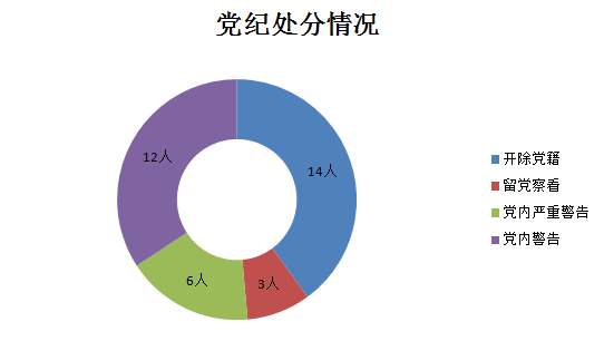 处分人员情况划分:开除党籍14人,占40%;留党察看3人,占8.6%;党内严重警告6人,占17.1%;党内警告12人,占34.3%。