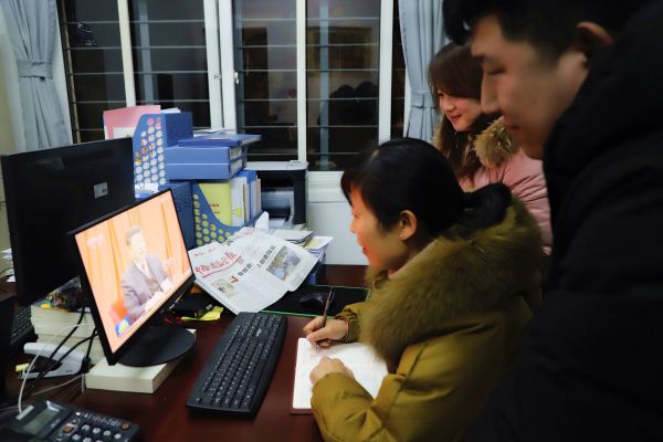 宣传部工作人员第一时间在办公室收看央视《新闻联播》,学习习近平总书记重要讲话,利用下班时间给自己充电。