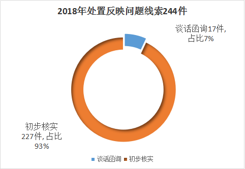 2018年区纪委监委主动作为,积极拓宽线索来源渠道,对信访举报、司法机关、其他行政执法机关、巡察整改、监督检查、审查调查中发现的问题线索进行分类处置、分批交办,建立专门台账并及时督办,实现了问题线索“零暂存”。全年共处置反映问题线索244件,同比增长106.8%。从处置方式看,谈话函询17件,占线索总数的7%;初步核实227件,占线索总数的93%。