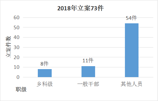 全区纪检监察机关严把立案关口,以党规、法律为指导,以扎实的初核及完善的预案为基础,坚持宽严相济原则,找准政策界限,切实提高立案准确性。2018共立案73件,其中涉及乡科级干部8件,同比增长166.7%;涉及一般干部11件,同比增长10%;涉及其他人员54件。
