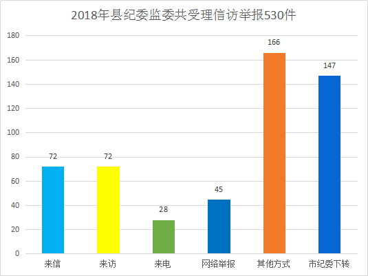从信访举报件受理类型来看,直接受理383件(次),其中来信72件,来访72次,来电28次,网络举报45件,其他方式166件;受理市纪委下转件147件。