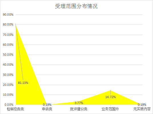 从信访举报件受理范围来看,检举控告类430件(次),申诉类1件,批评与建议类20件,业务范围外78件,无实质内容1件,分别占81.13%、0.19%、3.77%、14.72%、0.19%。