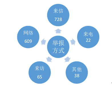 从举报方式看。来信728件,来访65次,有效电话举报22次,网络举报609件,其他38件。