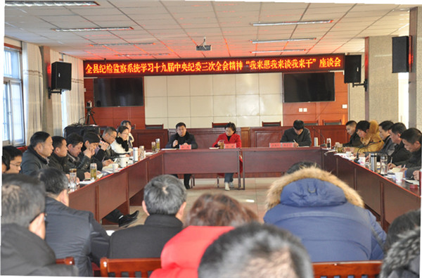 1月16日,霍邱县召开了全县纪检监察系统学习贯彻十九届中纪委三次全会精神座谈会,与会的纪检监察干部结合十九届中央纪委三次全会的召开和习近平总书记的讲话,联系纪检监察工作实际,谈学习体会,谈工作打算,以全会精神为指引,积极谋划新年工作。