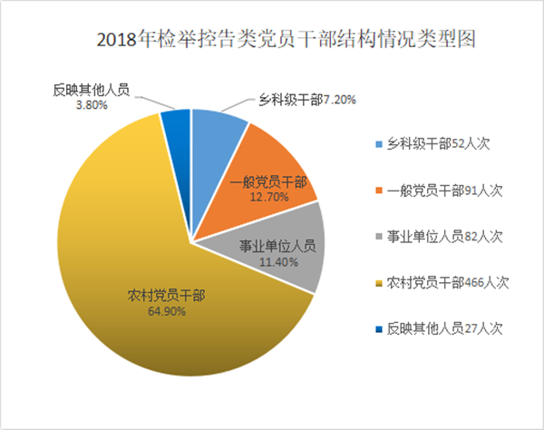 从检举控告类信访涉及人员来看,反映乡科级干部52人次,占检举控告类信访举报总量的7.2%;反映一般党员干部91人次,占比12.7%;反映事业单位人员82次,占比11.4%;反映农村党员干部466人次,占比64.9%;反映其他人员27人次,占比3.8%。(宿州市纪委监委)