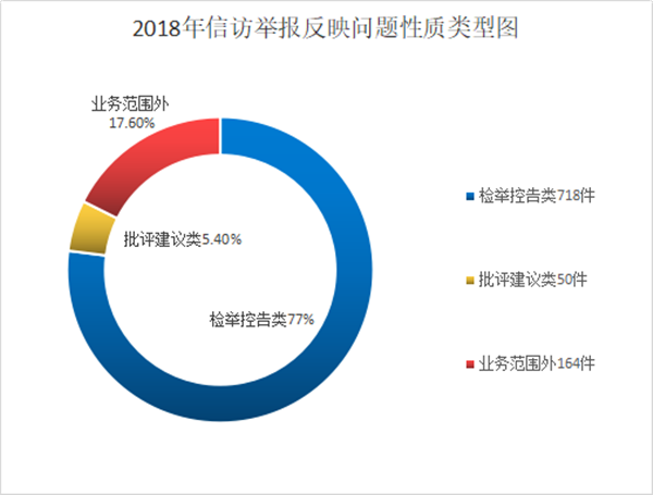 从信访举报反映问题的性质来看,检举控告类718件,占信访举报总量的77%;批评建议类50件,占比5.4%;业务范围外164件,占比17.6%。