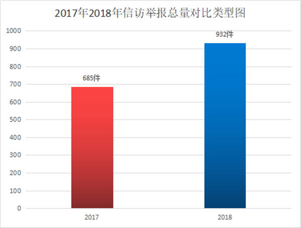 从受理信访举报总量来看,2017年受理信访举报总量685件,2018年同比上升36%。
