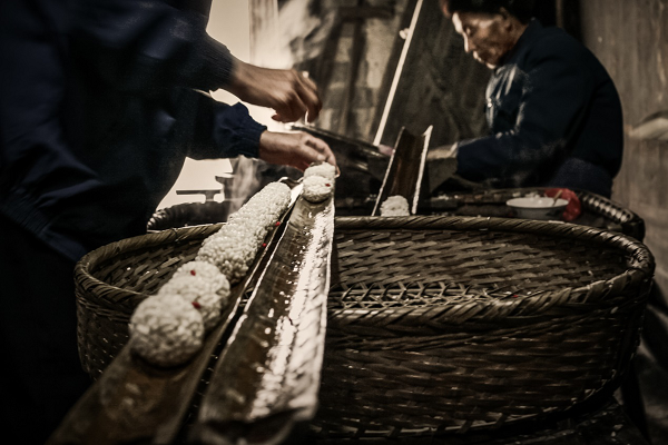 搓上七八个圆球之后,快速将其一字排开放到削好的毛竹片槽里,将两片毛竹槽上下一夹,左右快速搓动,一个个浑圆饱满的欢团就初步成型。