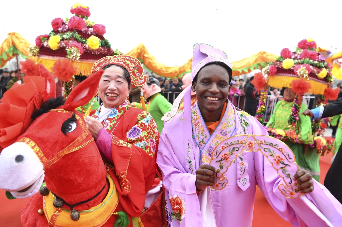 民俗表演很搞笑,洋小伙也来凑热闹。