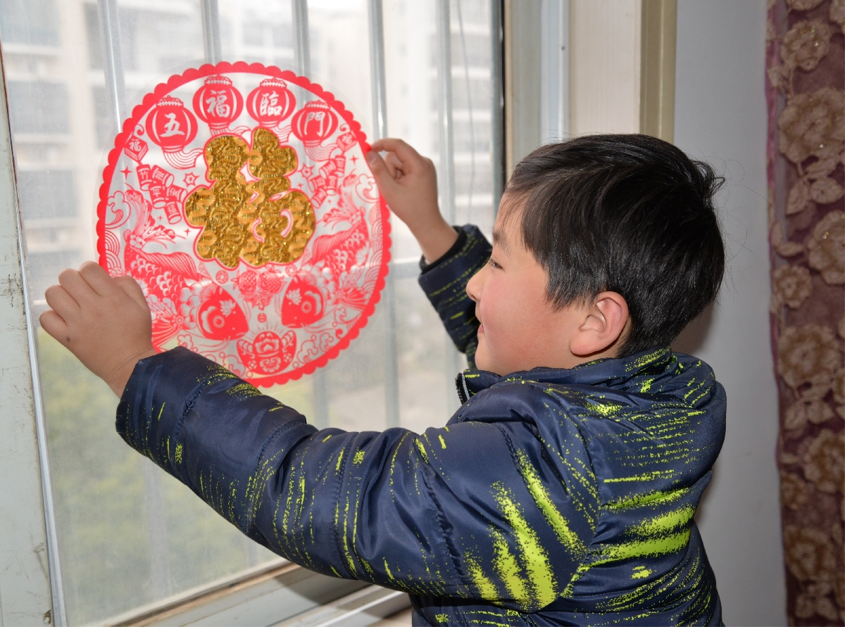 迎新春五福临门,贴窗花孩童显能,看他多认真。