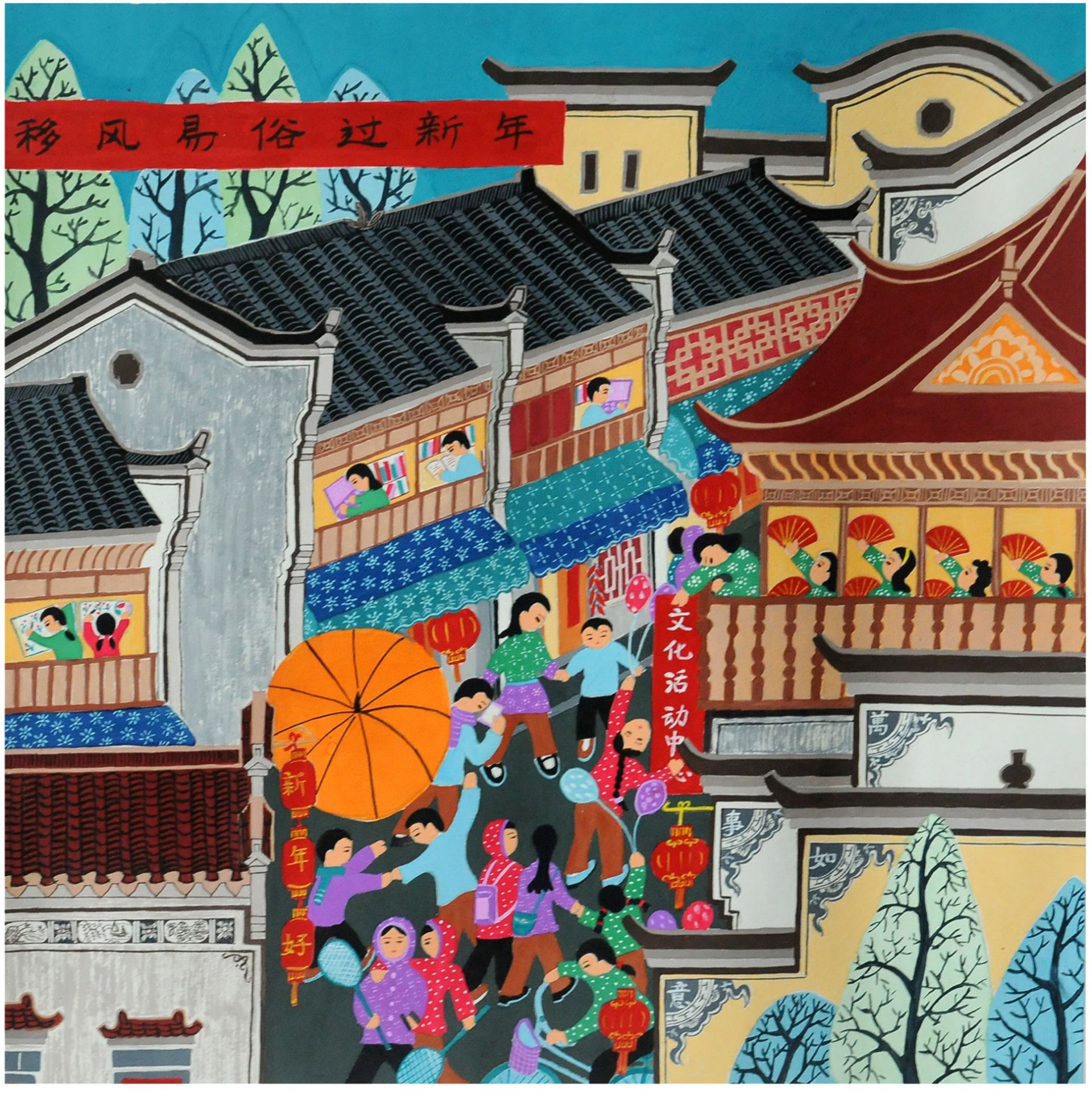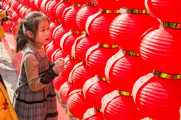 灯笼福签满街巷,稚童逐盏细“寻春”。