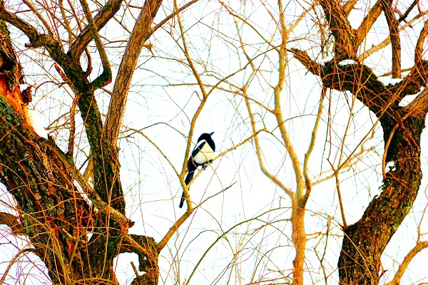 老树蓄力发新绿,喜鹊登枝早鸣春。