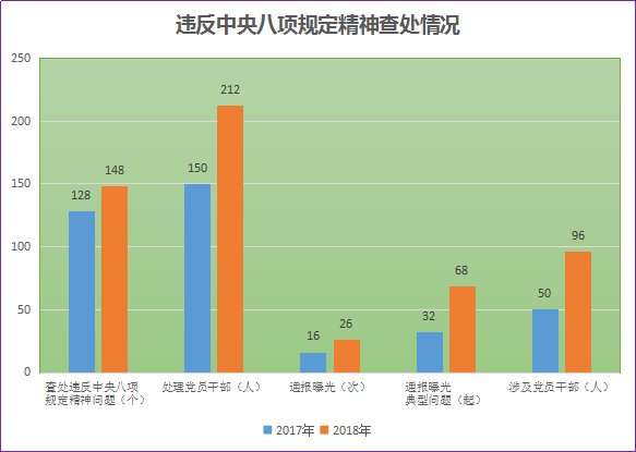 2018年,市纪委监委加强作风建设监督检查,把违反八项规定精神作为纪律审查的重要内容,及时处置“四风”问题线索。全市纪检监察机关共查处违反中央八项规定精神问题148起,处理212人,先后26次对68起典型问题进行通报曝光,涉及党员干部96人。