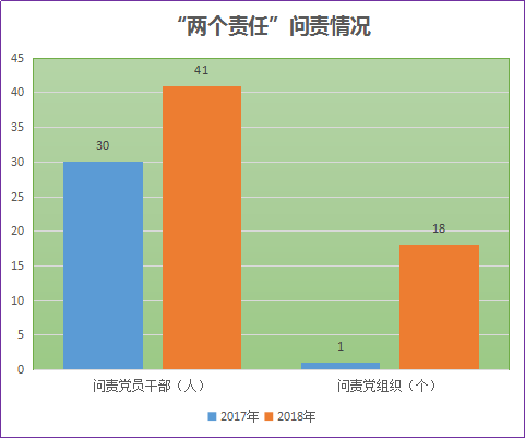 2018年,马鞍山市纪委加大力度推动“两个责任”落实,不断完善“定责、述责、督责、考责、问责”工作体系,对落实“两个责任”不力的41名党员领导干部、18个单位党组织予以问责。