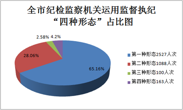 2018年,宣城市纪检监察机关运用监督执纪“四种形态”处理3878人次。其中,第一种形态2527人次,占“四种形态”处理总人次的65.16%;第二种形态1088人次,占28.06%,第三种形态100人次,占2.58%;第四种形态163人次,占4.2%。