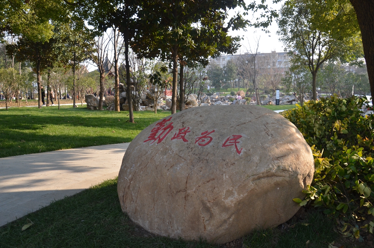 公园北入口处巨型廉政石刻“勤政为民”,和陋室内牌匾“政擢贤良”遥相呼应。