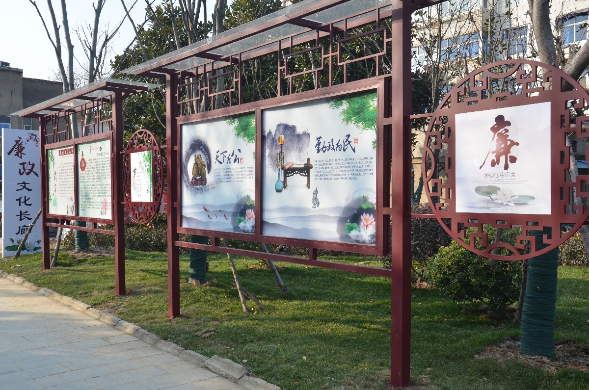 公园西入口新建的廉政文化长廊,采用仿古结构橱窗设计,以插画、书法、廉政故事、廉政名篇为内容,打造“一览式”廉政教育场所,吸引大量市民驻足观看。