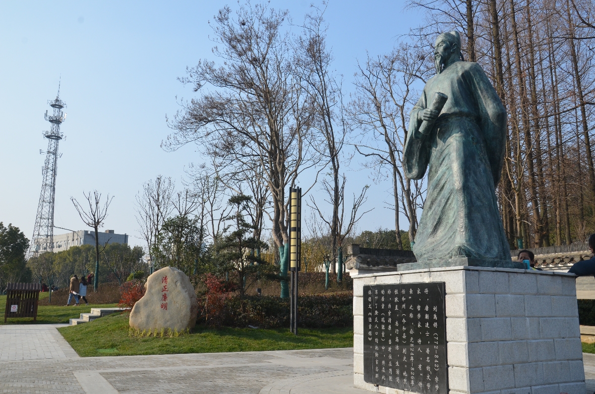 陋室门前“清正廉明”巨型石刻和刘禹锡铜像在夕阳下交相辉映。
