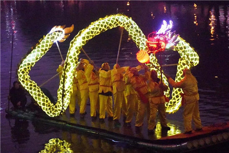 在义安区天井小镇文化旅游区湖面上,来自郊区大通镇河南嘴的渔民在为游客表演“水上龙灯”。(过仕宁摄)