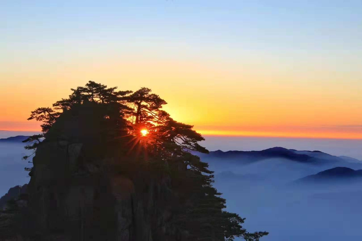 旭日初升,山峰映出太阳的七彩光芒,宛若一幅无边的美丽画卷。