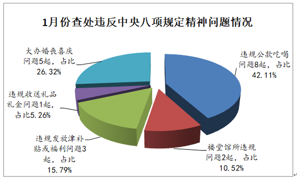 据统计,1月份,全市共查处违反中央八项规定精神问题19起,处理26人,给予党纪政务处分23人。在查处的19起问题中,违规公款吃喝问题8起,占42.11%;楼堂馆所违规问题2起,占10.52%;违规发放津补贴或福利问题3起,占15.79%;违规收送礼品礼金问题1起,占5.26%;大办婚丧喜庆问题5起,占26.32%。(六安市纪委监委)