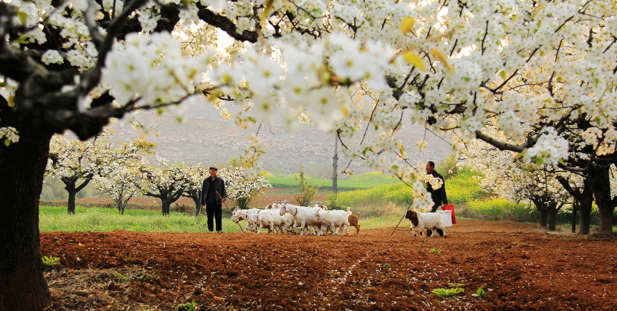 早春的梨花已经盛开,披着朝阳,伴着花香,晨光下的梨花林里两位老伯正在放羊,满树的梨花洁白如雪,在春日阳光的照射下显得神秘温暖。