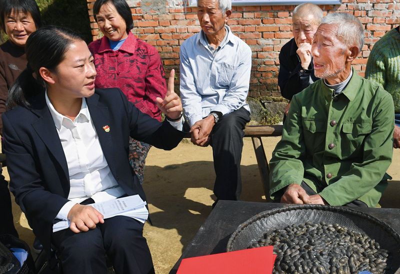 安徽省金寨县曾走出59位开国将军,有着“红军摇篮、将军故乡”的美誉,同时,也是国家级首批重点贫困县。2016年4月,习近平总书记在金寨县花石乡大湾村考察脱贫工作时指出,脱贫攻坚已进入啃硬骨头、攻坚拔寨的冲刺阶段,必须横下一条心来抓。我们必须坚定信心、下定决心,以“三严三实”的精神,如期打赢脱贫攻坚这场硬仗。上图为2017年10月27日,十九大代表、金寨县花石乡大湾村扶贫工作队副队长余静(前左)在金寨县大湾村与村民交流。她说:“大湾村一户不脱贫,我坚决不撤岗。”(新华社发陈力/摄)。下图为2018年4月9日航拍的金寨县花石乡大湾村安置点,许多贫困户依靠易地扶贫搬迁、危房改造、宅基地改革等政策,从原来的危房搬进了新居(许昊/摄)。