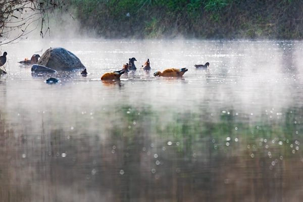 草长莺飞之时,湖水的温度慢慢升高,湖面上升腾起一层薄薄的雾气,吸引来一对对鸳鸯在水中嬉戏打闹。