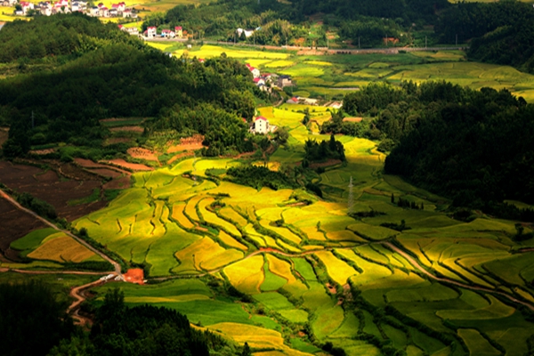 两山之间的梯田被大片的新绿和艳黄覆盖,好似一盘不小心被打翻的水粉颜料,带着青春的色彩,向我们奔涌而来。