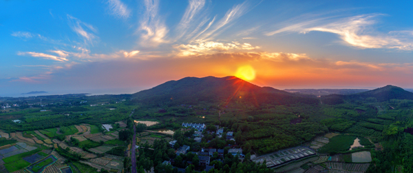 春分到来,安徽省合肥市四顶山下沃畴纵横,绿意浓郁。彩霞缤纷,掩映苍穹,在湛湛青天上描绘出灿烂云霞。天上人间,胜景如画。(郑成功/摄)