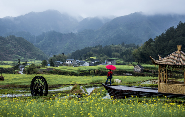 春分时节,江南景胜。远处山峦叠嶂、雾霭袅绕,近处水脉交织、花香袭人,白墙黑瓦的村落点缀在如翡绿野中,有人红衣红伞,随竹舫依依行来,为这静谧春光画出点睛一笔。(韩芳/摄)