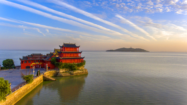 春分时节,日朗风暖,高阁临江,孤岛竦峙,霞色经空,縠纹织锦。云水连绵,升腾暖意,天地之间,遍布春光,远望去,春景满眼,春气满襟,春意满怀。(郑成功/摄)