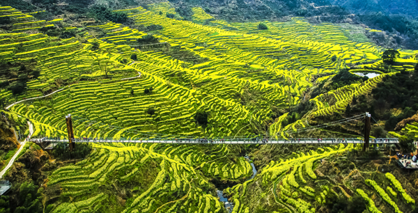 春分到来,安徽芜湖响水涧迎来了又一年油菜花盛的时节,碧水潺湲绕山而过,青山敞怀笑迎春风,层层梯田上菜花怒放,沿着山坡勾勒出道道黄绿锦带,游人登高远眺,沉醉在这如画美景中。(韩芳/摄)