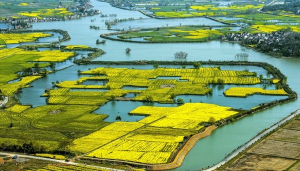 春分时节,安徽芜湖响水涧铺陈开韵味独特的水乡景致,碧蓝水域中,错落的花田犹如金箔片片展开,环水的堤坝犹如翠带延绵缠绕,沿岸村居临水看花、倚松听风,浸染漫漫春光。(韩芳/摄)