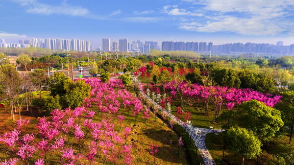 随着城市绿化的快速发展,钢筋水泥和绿树繁花和谐共容。春分时节,安徽省合肥市的一条主干道旁绽放万紫千红,和远处的高楼大厦交相辉映,在蓝天白云下升腾着蓬勃生机与春意。(郑成功/摄)