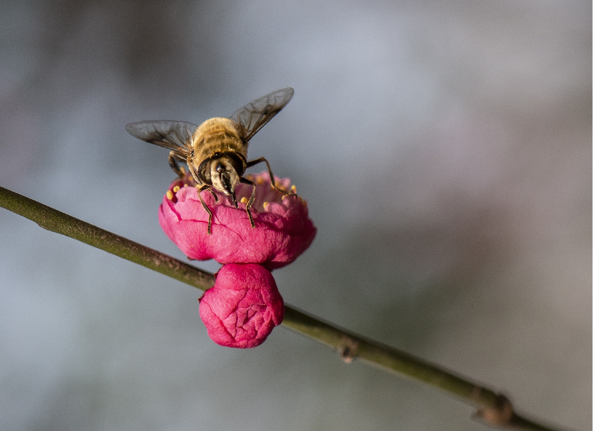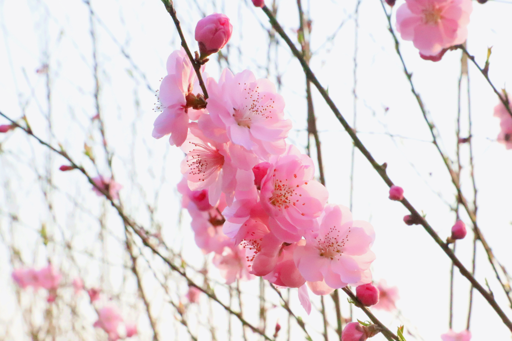 桃树枝头的蓓蕾惊醒,绽放出嫣然微笑的花朵,花香引得蜜蜂来。