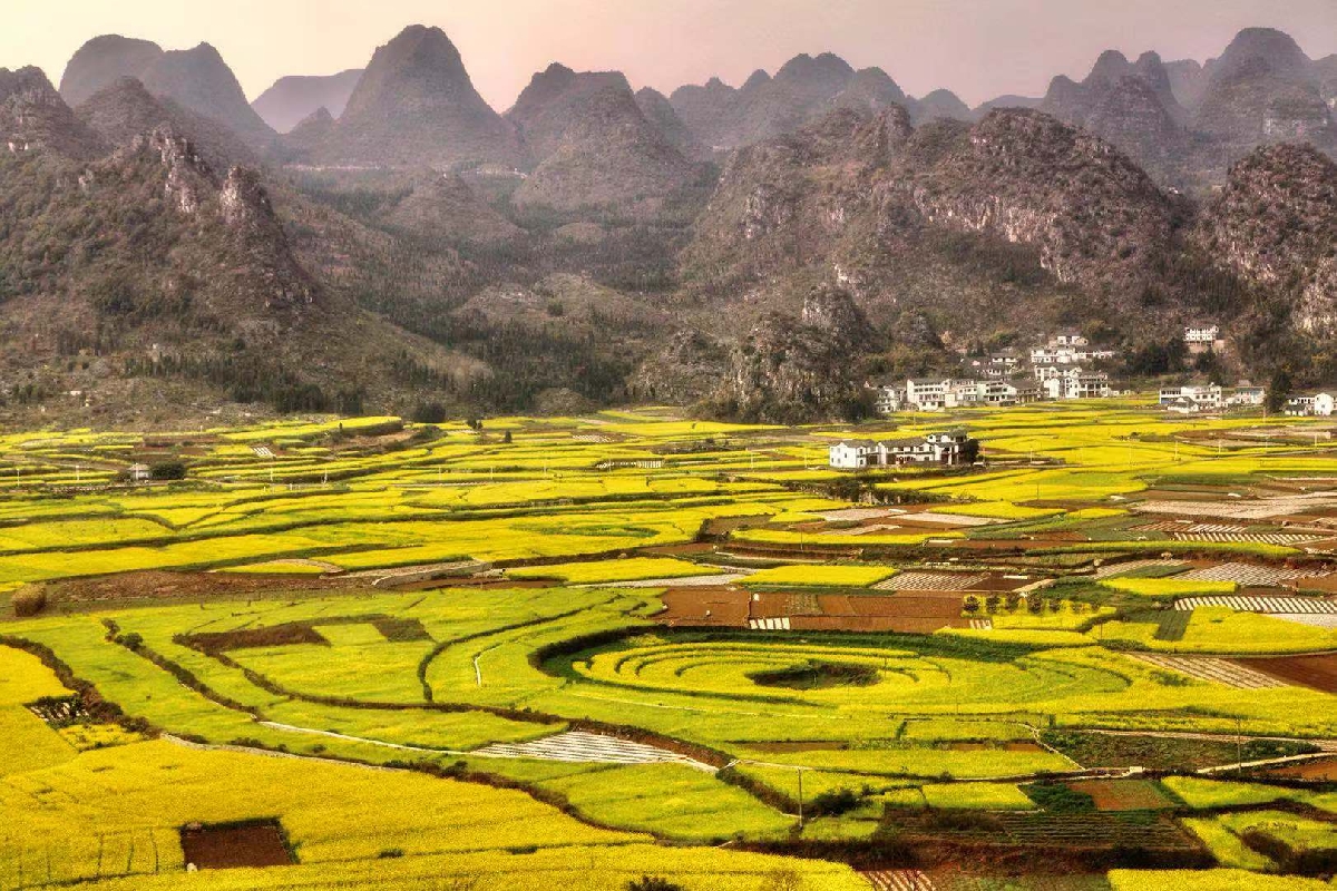 青葱的山峰高高耸立,与金黄色的田野交相辉映,漫山遍野的油菜花盛开,在春风里昂首怒放。