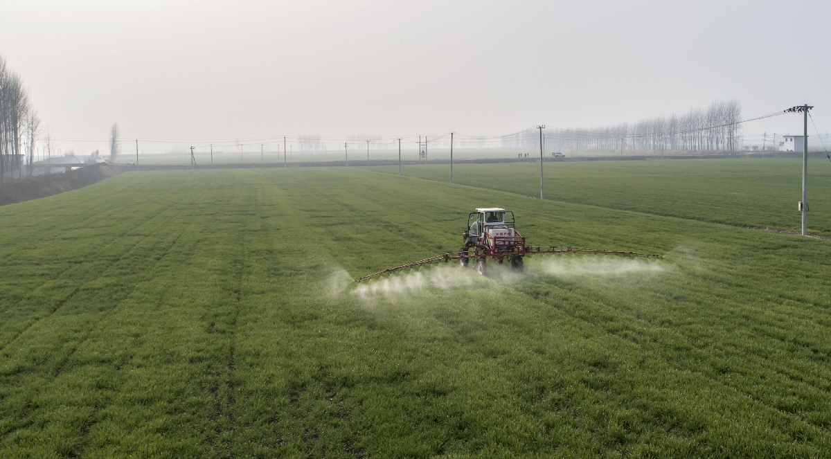 春风吹来,绿色的麦浪伴随着农机喷洒出的水雾在平原上涌动。