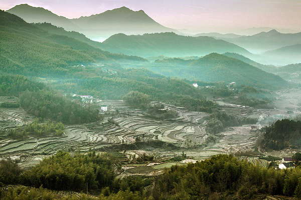 云拂山腰过,风吹雨点来。山中多阴雨,时而飘来一片云,落下几滴雨,未及淋湿地面,便将云雾召唤。薄雾浸染的森林覆盖着群山,层层梯田和茶园装点着大地,美丽别致尽收眼底。