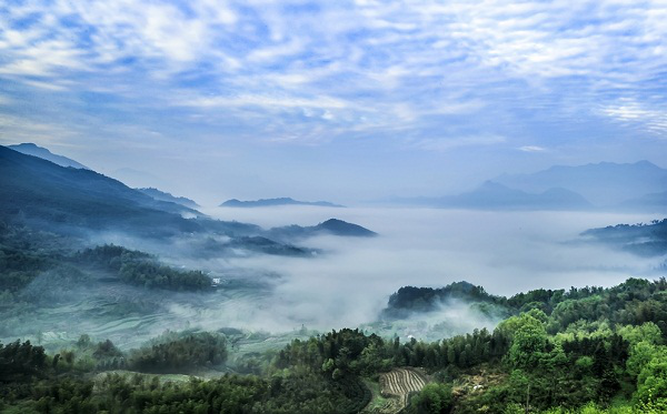 “九里云海”是水墨汀溪的一大奇观,因盘山公路上下各九里而得名。此地自然条件得天独厚,生态环境雅致清新,群山逶迄、层峦叠嶂,山间云雾缭绕、宛若云海,观之如临仙境。