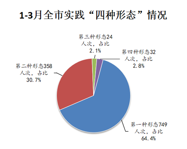 坚持抓早抓小,抓长抓常,注重源头预防,精准运用监督执纪“四种形态”,对苗头性、倾向性的问题早发现、早提醒、早纠正,防止“小问题”演变成“大错误”。1-3月,全市共运用监督执纪“四种形态”处理1163人次,其中,第一种形态处理749人次,占比64.4%,第二种形态处理358人次,占比30.7%。