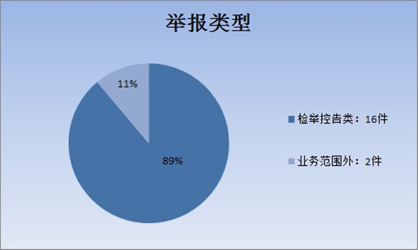 在直接受理的18件信访举报件中,按举报类型来分:检举控告类16件,占89%;业务范围外2件,占11%。