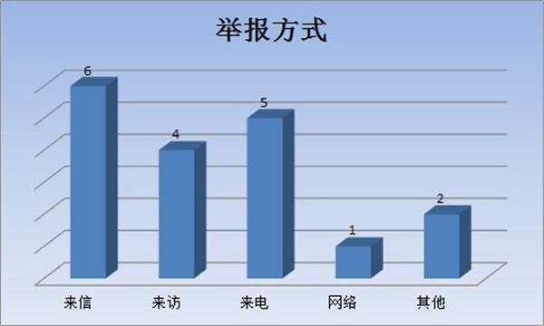 在直接受理的信访举报件中,按举报方式来分:来信6件,占33%;来访4件,占22%;来电5件,占28%;网络举报1件,占6%;其他2件,占11%。