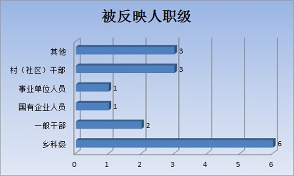 在检举控告类信访举报件中,按被反映人职级来分:乡科级干部6件,一般干部2件,国有企业人员1件,事业单位人员1件,村(社区)干部3件,其他人员3件。