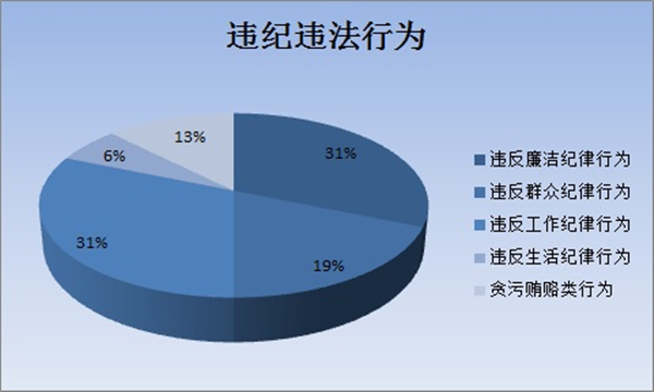 在检举控告类信访举报件中,从违纪违法行为占比来看,违纪行为总量高于职务违法犯罪行为。其中,违反廉洁纪律行为5件,占31%;违反群众纪律行为3件,占19%;违反工作纪律行为5件,占31%;违反生活纪律行为1件,占6%;贪污贿赂类行为2件,占13%。(宣城市纪委监委)