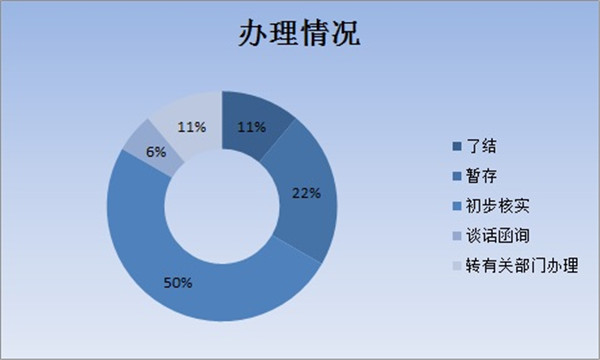 在直接受理的信访举报件中,按办理情况来分:了结2件,占11%;暂存4件,占22%;初步核实9件,占50%;谈话函询1件,占6%;转有关部门办理2件,占11%。