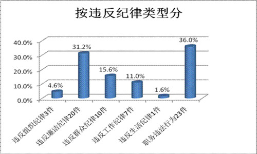 在85件检举控告类信访举报件中(含重复举报21件),按违反纪律类型分:违反组织纪律3件,占4.6%;违反廉洁纪律20件,占31.2%;违反群众纪律10件,占15.6%;违反工作纪律7件,占11.0%;违反生活纪律行为1件,占1.6%;职务违法行为23件,占36.0%。