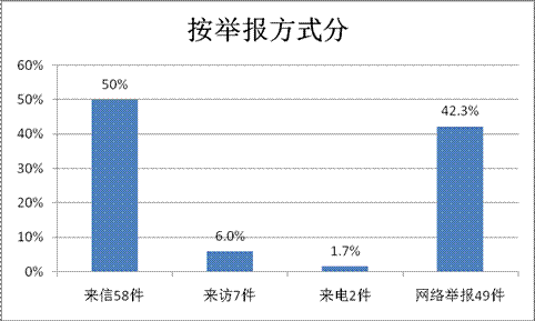 1-5月,区纪委监委共受理信访举报的总量为116件。其中,按举报方式分:来信58件、来访7件、来电2件、网络举报49件,分别占比50%、6.0%、1.7%、42.3%。